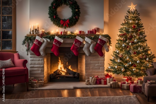 A traditional Christmas fireplace with stockings hanging a crackling fire, Ai Generated