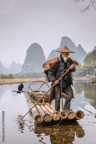 A traditional cormorant fisherman works on the Li River Yangshuo, China.