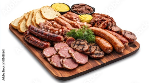 A traditional European sausage platter with various meats, mustard, and bread, arranged on a wooden board. No people are present