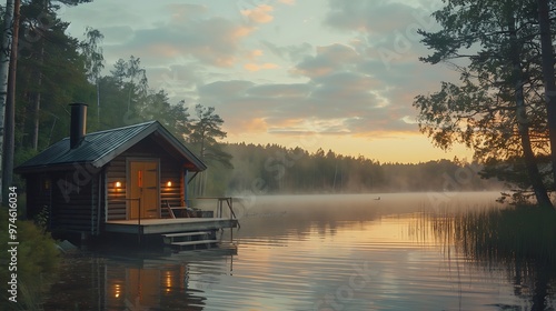 A traditional Finnish sauna ritual by a lakeside, with participants relaxing in the warmth of the sauna before taking a plunge into the cool lake. The scene captures the deep connection to nature