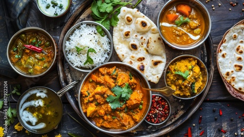 A traditional Indian thali meal with a selection of curries, rice, chapati, and pickles.