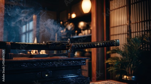 A traditional Japanese katana rests on a dark wooden stand, smoke rising in the background of a dimly lit room