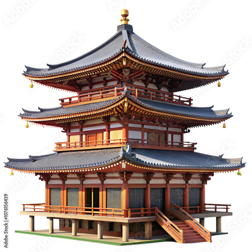 A traditional Japanese pagoda with intricate wooden details, tiered rooftops, and red accents, exemplifying classic Eastern architecture, set against a transparent background