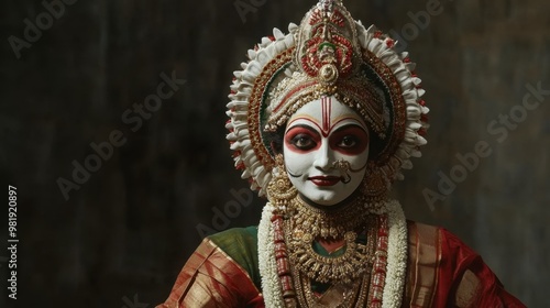 A traditional Kathakali dancer in full costume and makeup, performing a classical dance.