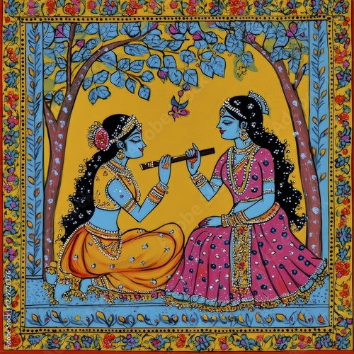A traditional painting featuring two figures, one playing the flute, surrounded by trees and intricate floral patterns, AI generated