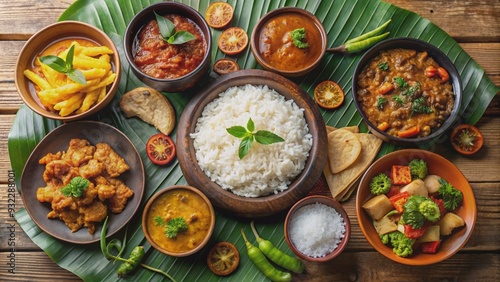 A traditional Sri Lankan meal of rice and curry with assorted side dishes , Sri Lankan, cuisine, food, curry, rice, meal
