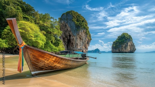 A traditional Thai longtail boat anchored on the shores of Ao Nang Beach, with scenic limestone formations in the background.