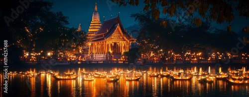 A traditional Thai temple illuminated by lanterns, with a river full of Krathongs in the foreground