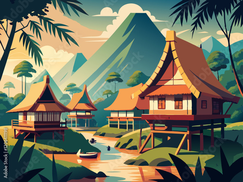 A traditional Torajan village with intricate tongkonan houses in Sulawesi.