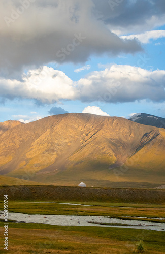 A traditional white yurt sits in a vast golden and green valley with a large, sunlit mountain in the background under a beautiful cloudy sky