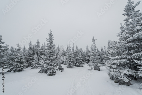 a trail stretching into the distance through a fabulous snow covered forest
