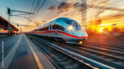 A train is speeding down the tracks with the sun setting in the background