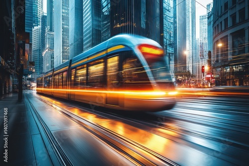 A train moves quickly on tracks in a city with tall buildings.