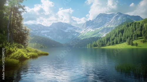 A tranquil and magical image featuring a lake surrounded by beautiful woodland.
