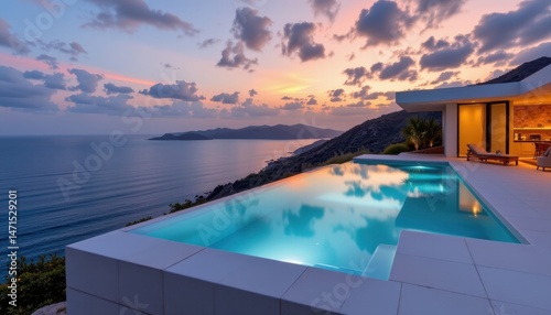 a tranquil beachfront view at sunset, featuring an infinity pool with a white deck overlooking a vast body of water
