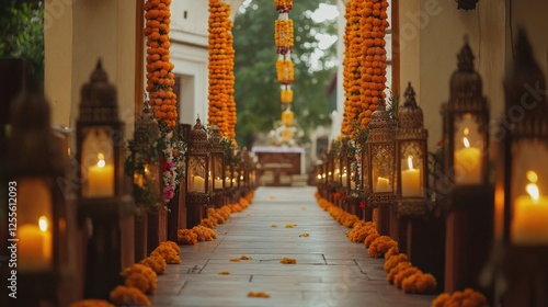 A tranquil church aisle decorated with bright marigold garlands and intricate traditional lanterns glowing warmly in the serene light