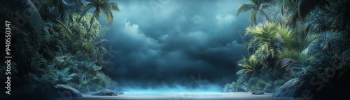 A tranquil coastal scene with dark clouds and lush greenery, ideal for relaxation and nature-themed projects.