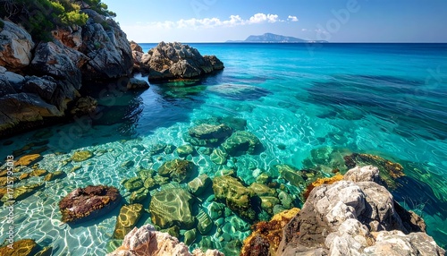 A tranquil cove with crystal-clear turquoise water and varied rocks, perfect for a relaxing beach escape. The bright blue sky and distant island enhance the peaceful atmosphere.