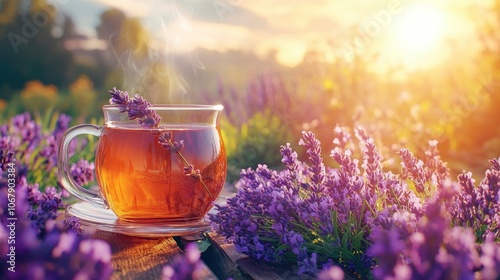 A tranquil cup of tea surrounded by blooming lavender fields at sunset