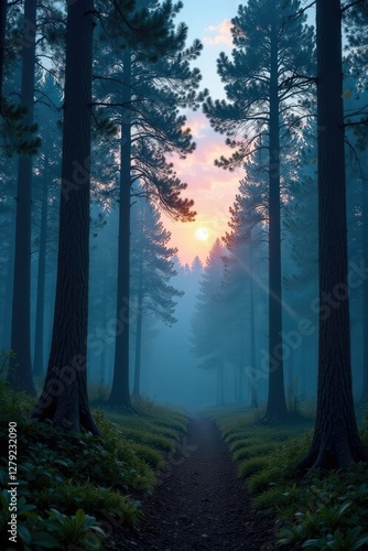 A tranquil forest at dusk with a pastel blue sky, woods, nature, forest