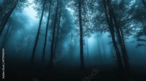A tranquil forest enveloped in mist features tall dark tree silhouettes rising against a mysterious foggy backdrop that creates an ethereal atmosphere