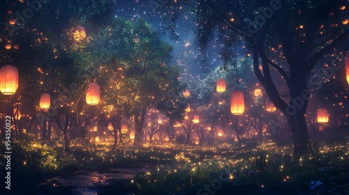 A tranquil forest in 2050 where glowing lanterns and bioluminescent plants light up the night during the Yi Peng festival under a sky full of twinkling stars