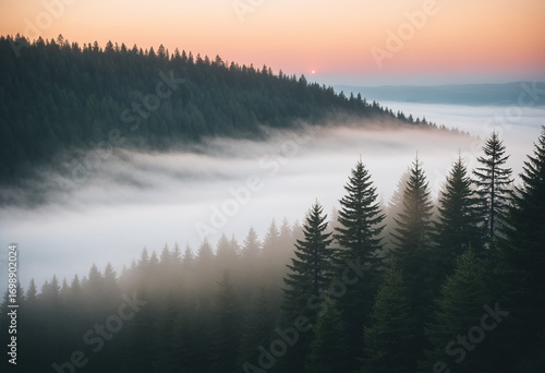 A tranquil forest landscape at sunrise, featuring tall evergreen fir trees emerging