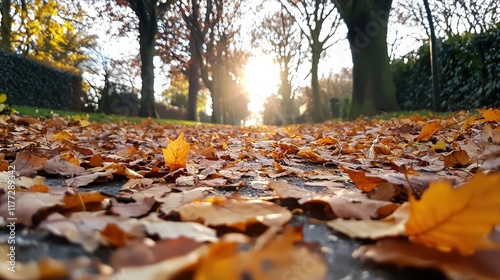 A tranquil forest path covered in fallen autumn leaves, with sunlight streaming through the trees