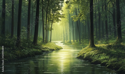 A tranquil forest river winding its way through tall trees, untouched, green, remote location