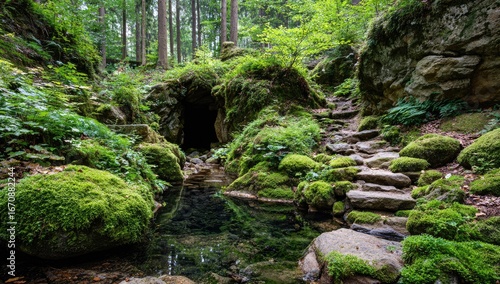 A tranquil forest scene with moss-covered rocks and a gentle stream winding through lush greenery, inviting a sense of peace and connection with nature.