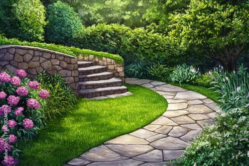 A tranquil garden scene with stone path steps and lush greenery in a serene landscape view