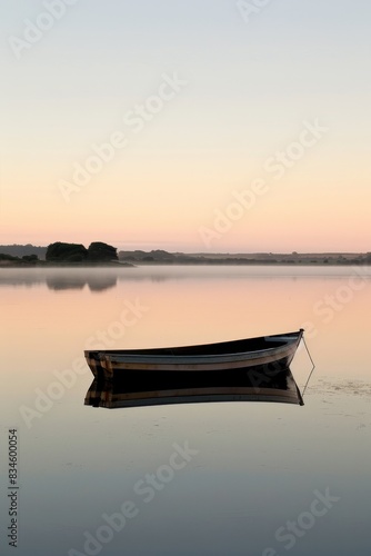 A tranquil lake scene at sunrise with a clear sky, leaving a large area of empty space for text.