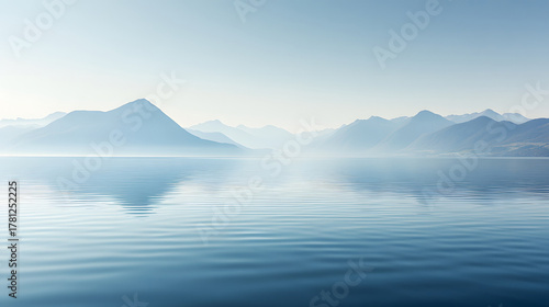 A tranquil lake with mountains in the distance, their reflections visible on the calm water's surface, creating a peaceful natural scene.