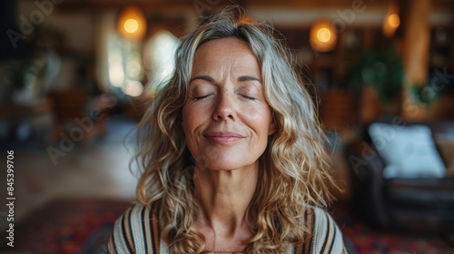 A tranquil mature woman with wavy hair and closed eyes portrays serene meditation