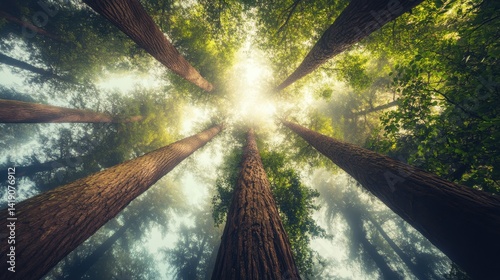 A tranquil, misty morning in a deep forest with towering, majestic trees reaching toward the sky, their roots and branches entwined in an ancient embrace.