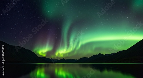 A tranquil mountain lake reflecting a sky filled with auroras and shooting stars