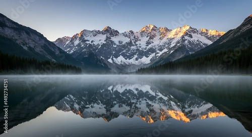 A tranquil mountain lake reflecting snow‑capped peaks at sunrise