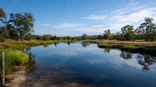 A tranquil natural landscape featuring a calm water body reflecting the clear blue sky and scattered clouds