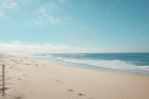 A tranquil ocean coastline featuring soft sand, clear blue skies, and gentle waves under the warmth of the sun. Captures the serenity and beauty of nature by the sea.