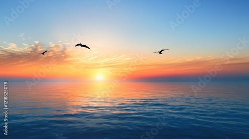 A tranquil ocean view at dawn, soft ripples in the water reflecting the first light of day, with mist rising from the surface and a few birds flying overhead.