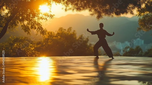A tranquil outdoor scene with a person doing tai chi at sunrise, blending fitness with mindfulness for enhanced mental health.
