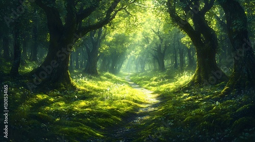 A Tranquil Path Through a Lush Green Forest, Filled with Vibrant Moss and Towering Trees