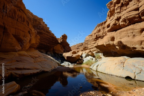 A tranquil pool of water reflects the towering sandstone cliffs that create a dramatic and breathtaking canyon in the Sahara Desert.