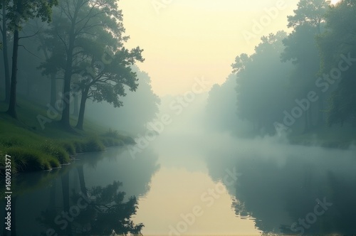 A tranquil river at dawn with mist and tree reflections creates a serene natural landscape.