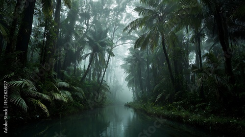 A tranquil river flows through a dense, misty jungle, surrounded by lush vegetation