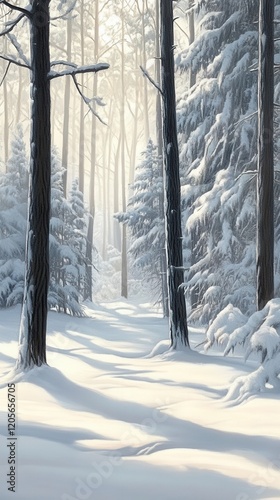 A tranquil snowy forest path, bathed in soft morning light and surrounded by serene trees.