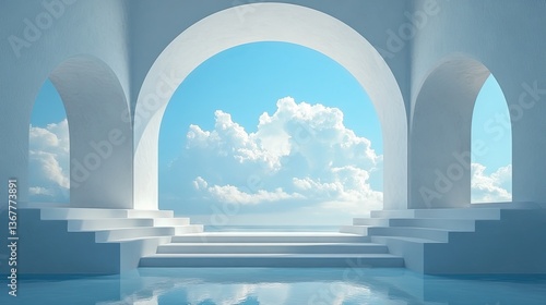 A tranquil space with arches and steps leading to a bright, cloud-filled horizon