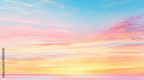 A tranquil sunset sky blending soft pinks and blues, reflecting serene beauty and calmness over a peaceful horizon.