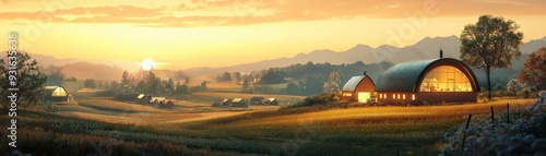 A tranquil sunset view over a peaceful countryside with barns and rolling hills bathed in golden light.
