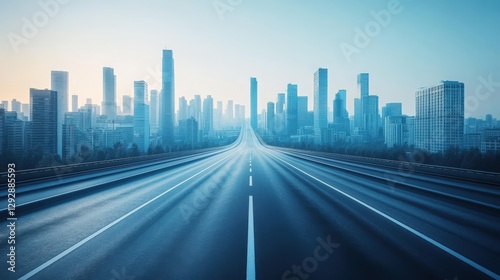 A tranquil urban landscape showcasing a modern city skyline at dawn, with an empty highway leading into the heart of the cityscape filled with towering glass skyscrapers.